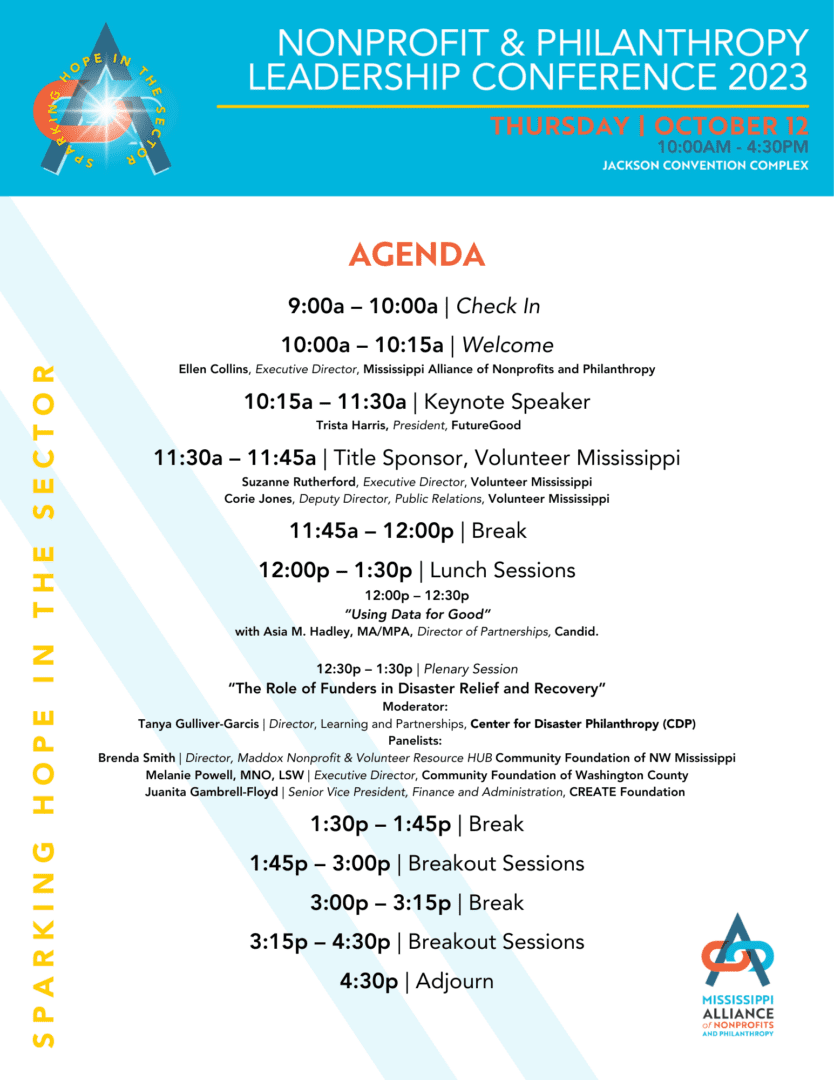 Please join us for the Mississippi Alliance of Nonprofits and Philanthropy's 2023 Nonprofit & Philanthropy Leadership Conference "Sparking Hope in the Sector". This dynamic, inspiring and sure-to-be transformative event is aimed at igniting hope and fostering resilience within the nonprofit and philanthropic sector, designed for leaders, board members, and changemakers who are passionate about driving positive change and making a lasting impact in their communities.